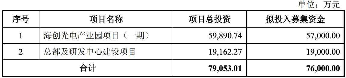 而2024年12月,海创光电更新的招股书则显示,该公司的拟募资金额调整为7.6亿元。对比可知,海创光电删减了“补充流动资金项目”,该项目原计划投入5亿元。与之对应的是,上海证券交易所曾在第一轮问询函中关注了募投项目。