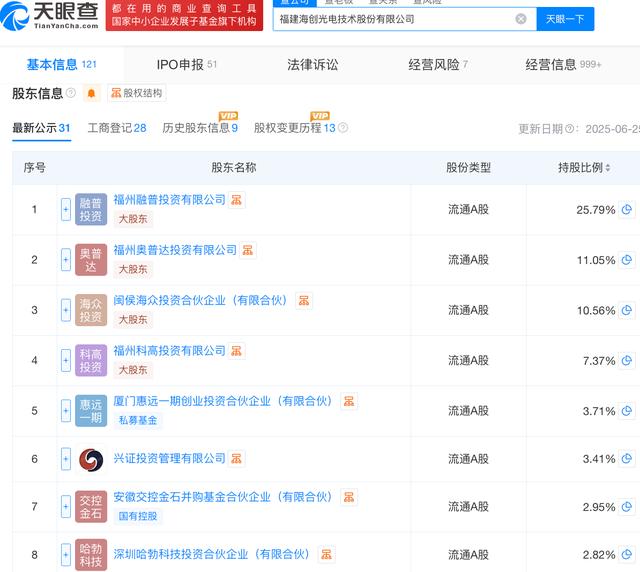 天眼查App信息显示,海创光电成立于2016年3月。目前,该公司注册资本为6516.72万元,法定代表人为凌吉武,主要股东包括凌吉武、兴业证券、金石投资、哈勃投资、中信证券、七匹狼等。