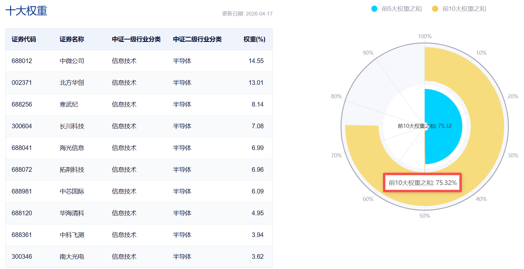 目前该指数前十大集中度75%在同类半导体主题指数中位居第一,龙头含量高、周期传导性强,有望充分受益于存储大周期、晶圆厂扩产、算力自主可控与国产替代浪潮。