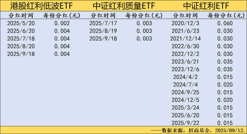 近日,招商基金旗下的三只低费率分红型ETF[港股红利低波ETF(520550.SH)、中证红利质量ETF(159209.SZ)&中证红利ETF(515080.SH)]齐齐发布了9月的分红方案,详细信息如下: