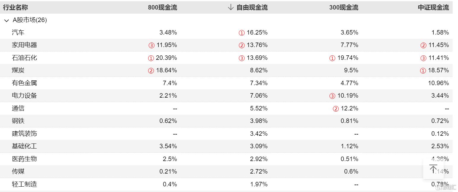 中证现金流的三大权重行业分别是煤炭(18.57%)、家用电器(11.45%)和石油石化(11.41%)。