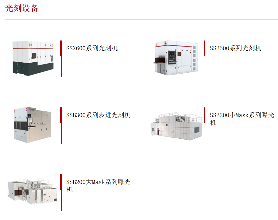 官网信息显示,SMEE主要光刻机产品有SSX600系列光刻机、SSB500系列步进光刻机、SSB300系列步进光刻机、SSB200小Mask系列曝光机、SSB200大Mask系列曝光机。
