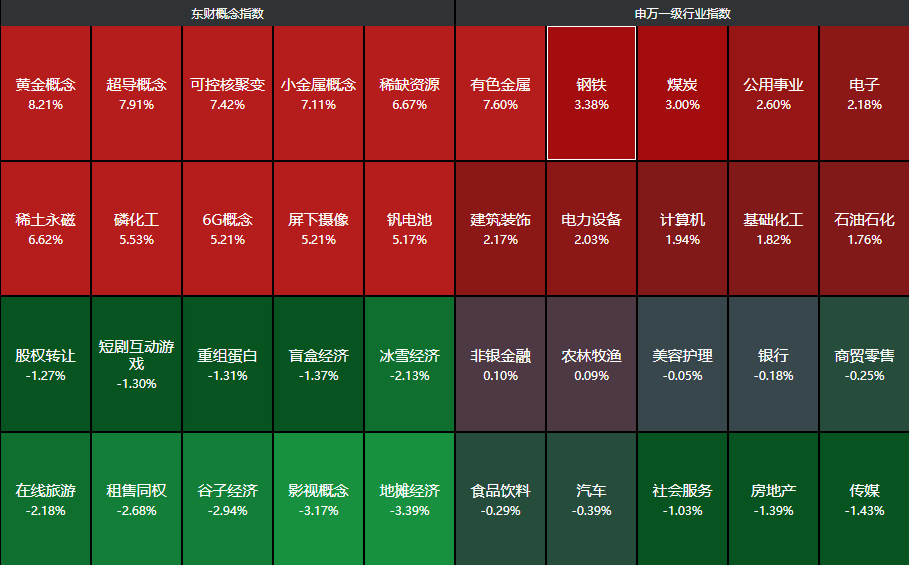 今天市场放量至2.67万亿,早盘以半导体为代表的AI算力和以黄金、铜为代表的资源股暴涨,沪指时隔十年站上3900点,但午盘中芯国际、华虹半导体双双跳水,稍微拖累了科技股情绪,新易盛等nv链也跳水,反而是煤炭、钢铁等防守方向走强。