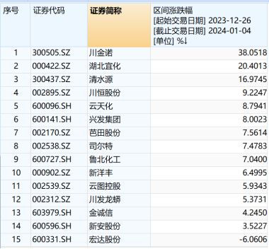 二级市场方面,在该利好刺激下,磷化工概念股在A股三大指数震荡调整的情况下逆市上涨,根据Wind磷化工指数(8841179.WI),川金诺(300505.SZ)、湖北宜化(000422.SZ)、清水源(300437.SZ)、川恒股份(002895.SZ)、云天化(600096.SH)等多家公司都有一波不错的表现,川金诺在2023年12月26日至2024年1月4日的7个交易日内,股价涨幅超38%,湖北宜化的涨幅也超过20%,Wind磷化工指数15只成份股中,只有宏达股份下跌,其他股票均有不同程度的涨幅。