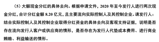 不过,A公司在申请上市前大额分红的行为引起了北交所的关注。 根据A公司于2022年9月发布的《2022年半年度权益分派实施公告》显示,其分派当期红利4.61亿元; 2023年4月,A公司又发布《2022年年度权益分派预案公告》公告,再次派发现金红利3.59亿元。 上述两次现金分红金额合计达8.20亿元,主要流向实际控制人及其控制的企业。