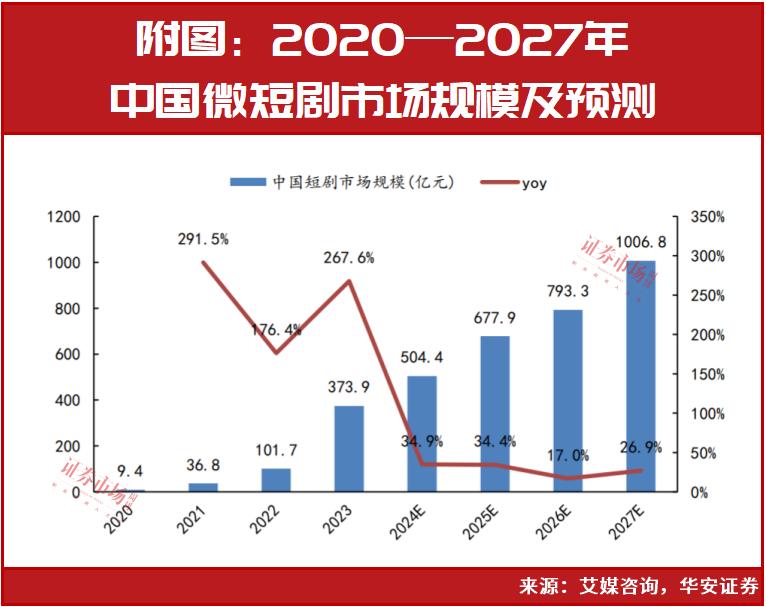 微短剧市场空间=用户付费+广告+平台分账。经华安证券测算,付费短剧市场规模为207.4 亿(以用户充值为主),免费短剧市场规模为 166.5 亿元(以平台分账+广告为主),其中,分账短剧整体市场规模约8亿元,广告市场规模约158 亿元。预计2024—2027年微短剧市场规模为 505.6/634.3/749.9/856.5 亿元,2023—2027年CAGR达23.0%。