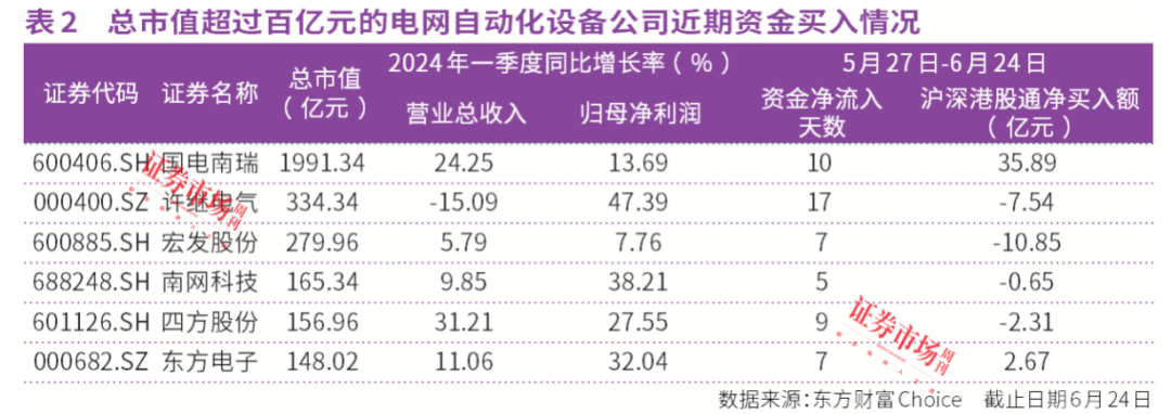 就在近日,国家连续出台了利多电网建设的政策,市场资金也在持续看多电网设备股,而作为电网设备龙头的国电南瑞显然也是受益公司之一,其在5月27日至6月24日期间的20个交易日中,出现了10个交易日资金净流入情况。同期,代表外资态度的北向资金也净买入35.89亿元(见表2)。
