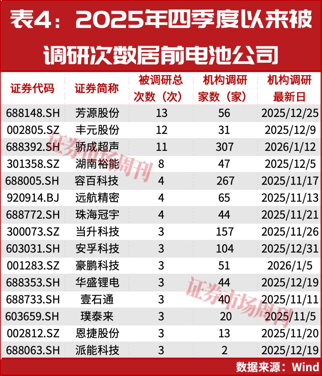 在电池公司中,芳源股份、丰元股份、骄成超声、湖南裕能、容百科技等15家公司被调研次数在3次或以上。其中芳源股份、丰元股份、骄成超声被调研次数分别有13、12、11次。