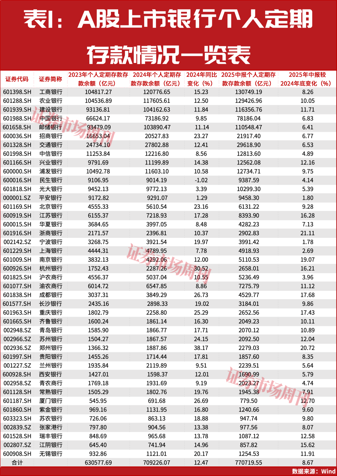 尽管存款利率持续走低,2024年上市银行的个人定期存款余额依然同比增长了12.47%,2025年上半年较2024年底同比增长了8.6%(见表1)。