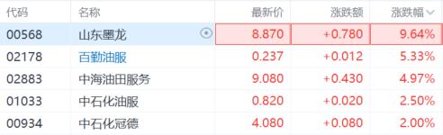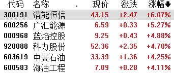 港、A市场油气股全线走高。A股中,潜能恒信涨超6%,广汇能源涨超5%,蓝焰控股、科力股份涨超4%;港股中,山东墨龙涨超9%,百勤油服涨超5%,中海油田服务、中石化油服跟涨。