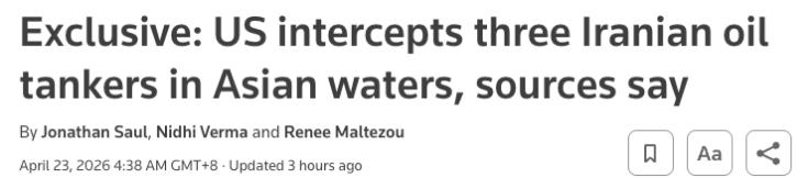 据路透社援引多位美国及印度航运与安全消息人士透露,美军在亚洲水域拦截至少三艘挂伊朗旗帜的油轮,包括两艘超级油轮,合计货量超200万桶原油,并正将其引导至印度、马来西亚和斯里兰卡附近的阵地。
