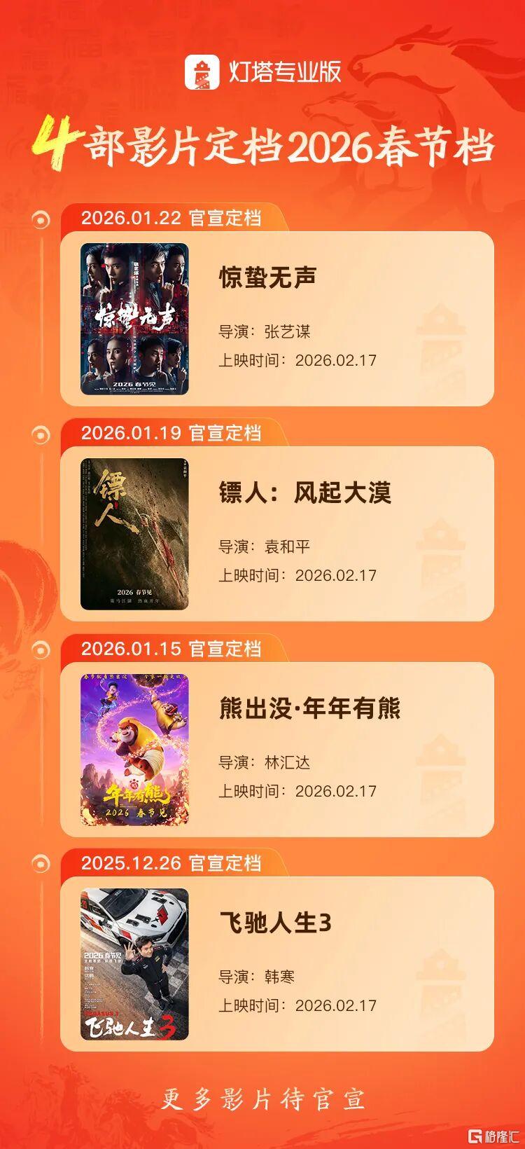 在传统传媒领域,已经有四部影片定档2026年春节。已有《惊蛰无声》、《飞驰人生3》、《镖人:风起大漠》和《熊出没·年年有熊》四部影片正式定档2026年大年初一上映,题材涵盖剧情、喜剧、动画及武侠,类型多元。