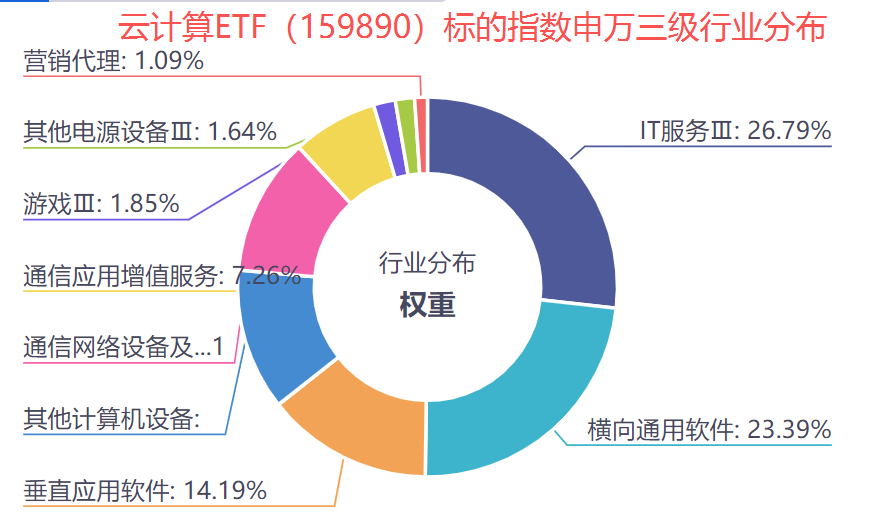 数据显示,云计算ETF(159890)跟踪云计算(930851.CSI),标的指数中IT服务+横向通用软件+垂直应用软件三大行业合计占比约65%,对AI应用有深度布局。指数前十大成份股覆盖科大讯飞、金山办公等软件开发龙头,中际旭创新易盛两大光模块龙头,以及中科曙光、浪潮信息等电子终端及组件龙头等,双重聚焦AI基建+AI应用,或为AI大时代一站式解决方案