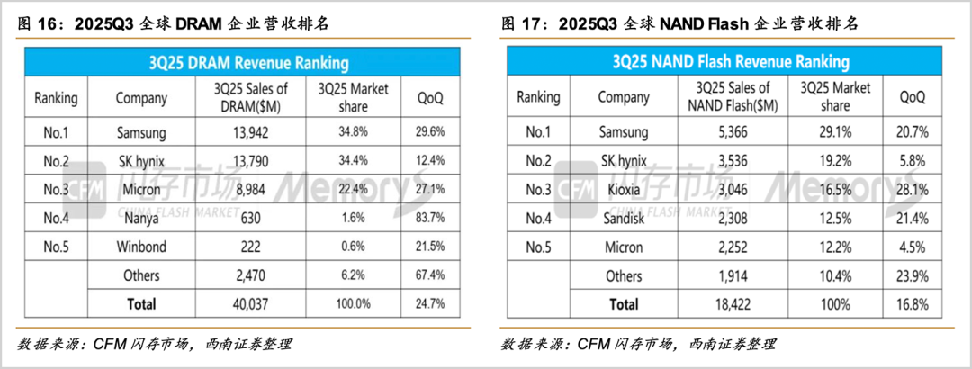 2025年Q3,DRAM领域前三大厂商就瓜分近92%的蛋糕,NAND赛道前五名玩家合计占据了90%的市场份额。