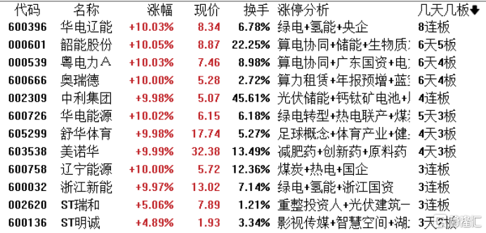 高位股方面,华电辽能8连板,韶能股份6天5板,粤电力A、奥瑞德6天4板,中利集团4连板,华电能源5天3板。