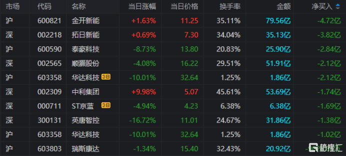 龙虎榜单日净卖出额前三为金开新能、拓日新能、泰豪科技,分别为4.72亿元、3.82亿元、2.84亿元。