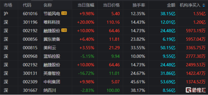 龙虎榜中涉及机构专用席位的个股中,当日净买入额前三为唯科科技、冀东装备、美利云,分别为1.2亿元、5957.04万元、3365.75万元。