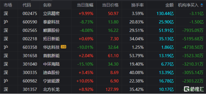 龙虎榜中涉及机构专用席位的个股中,当日净卖出额前三为立讯精密、泰豪科技、顺灏股份,分别为3.11亿元、1.5亿元、7935.09万元。