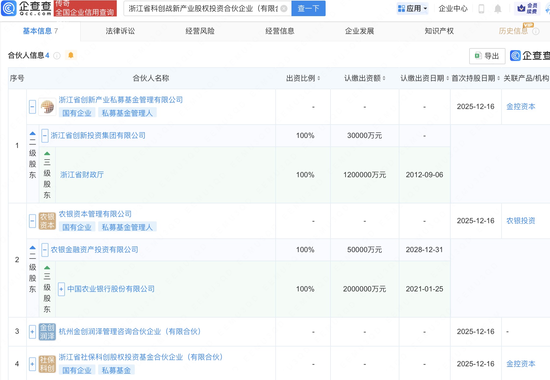 企查查APP显示,近日,浙江省科创战新产业股权投资合伙企业(有限合伙)成立,出资额101.03亿元,经营范围包含:以私募基金从事股权投资、投资管理、资产管理等活动。企查查股权穿透显示,该企业由浙江省创新产业私募基金管理有限公司、农业银行(601288)旗下农银资本管理有限公司、浙江省社保科创股权投资基金合伙企业(有限合伙)等共同出资。