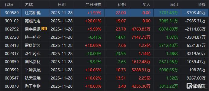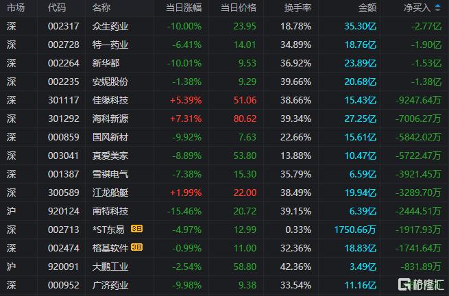龙虎榜单日净卖出额前三为众生药业、特一药业、新华都,分别诶2.77亿元、1.9亿元、1.53亿元。