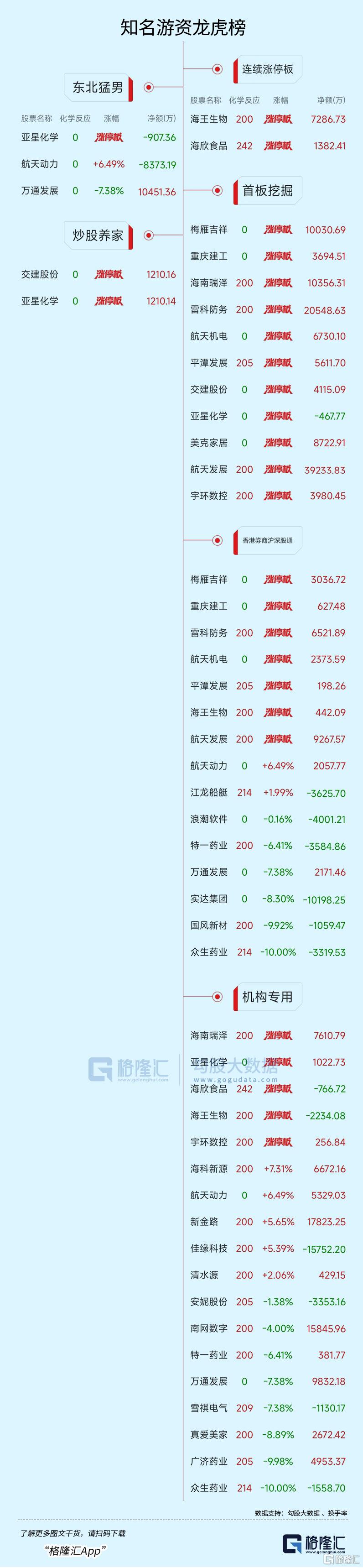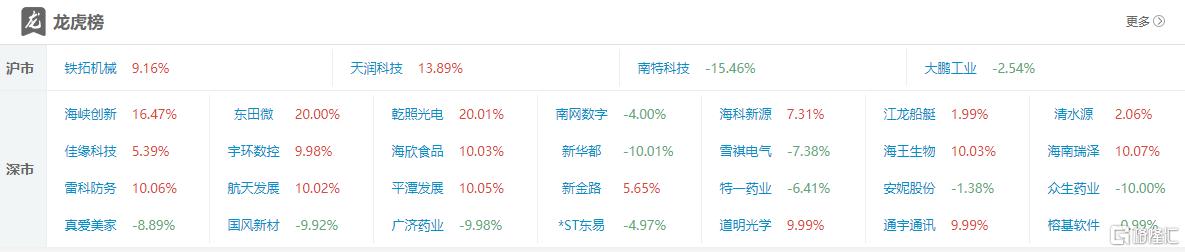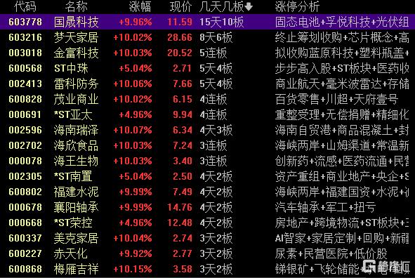 焦点股方面,并购重组的国晟科技15天10板、金富科技5连板,商业航天概念股航天发展11天7板,股权转让的梦天家居8天6板,大消费板块茂业商业4连板。