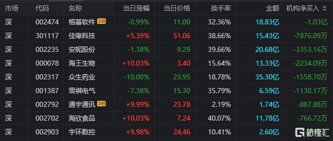 龙虎榜中涉及机构专用席位的个股中,单日净卖出额前三为佳缘科技、安妮股份、海王生物,分别为7876.09万元、3353.16万元、2234.09万元。