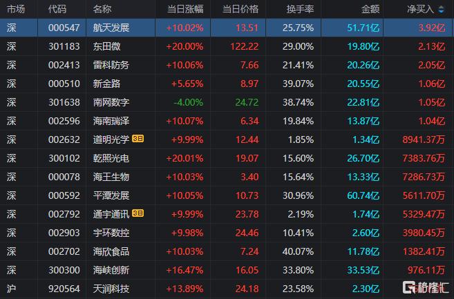 龙虎榜单日净买入额前三为航天发展、东田微、雷科防务,分别为3.92亿元、2.13亿元、2.05亿元。