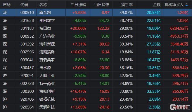 龙虎榜中涉及机构专用席位的个股中,当日净买入额前三为新金路、南网数字、东田微,分别为1.2亿元、1.03亿元、6284.92万元。