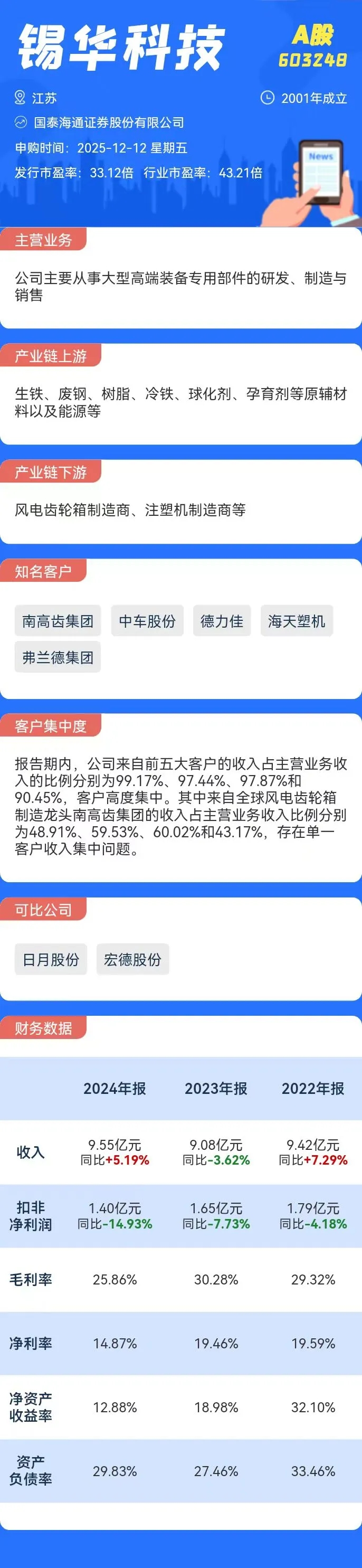 公司业绩方面,2022年至2024年,锡华科技分别实现营业收入9.42亿元、9.08亿元、9.55亿元,分别实现净利润1.83亿元、1.77亿元、1.42亿元。公司预计2025年实现营收12.77亿元至13.54亿元,同比增长33.74%至41.85%;实现净利润2.04亿元至2.17亿元,同比增长43.89%至52.61%。整体而言,锡华科技近年来业绩波动显著,净利润连续两年下滑,2025年或重新实现增长。
