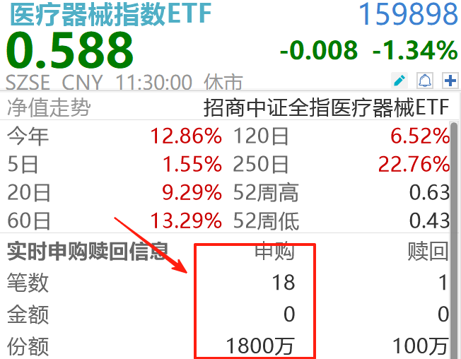 资金面或许也是基于这一判断,今日午盘大幅加仓医疗器械指数ETF(159898)。整个午盘,ETF调整期间获得1700万份的净申购,“低吸”姿态很明显。