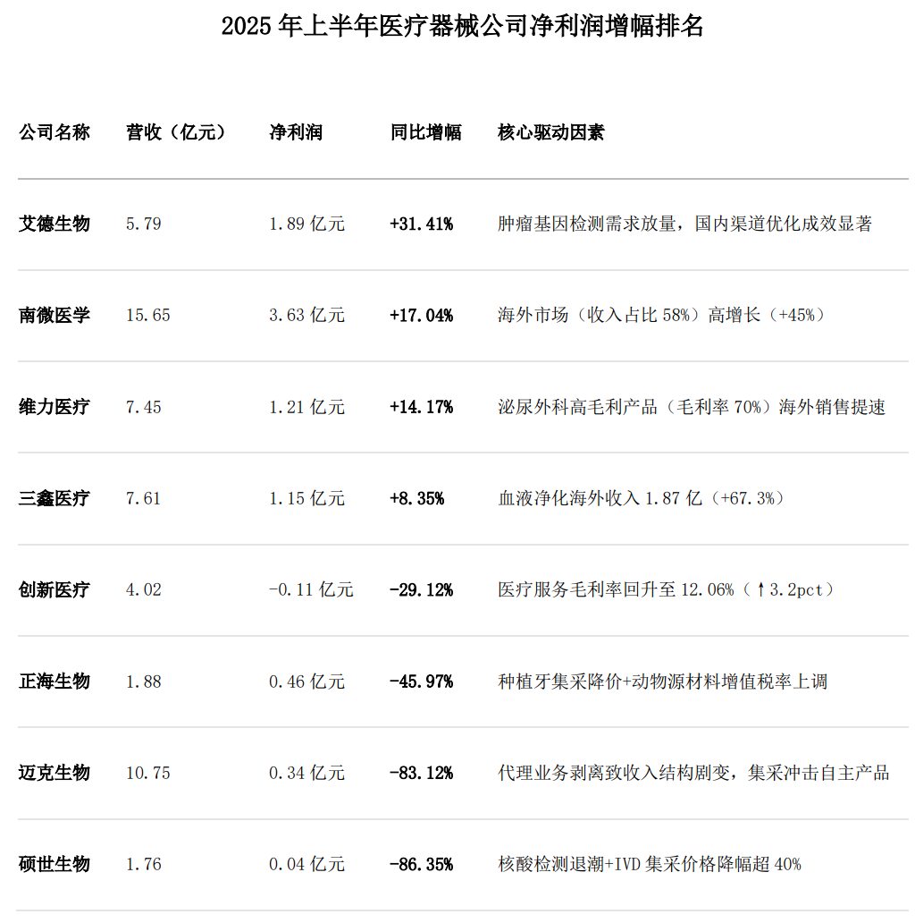 首先是增长阵营——艾德生物表现亮眼,净利润同比增长31.41%,达到1.89亿元,领跑增幅榜。南微医学以15.65亿元的营收位居前列,净利润增长17.04%,展现稳健经营能力。维力医疗净利润增长14.17%,同样表现不俗。