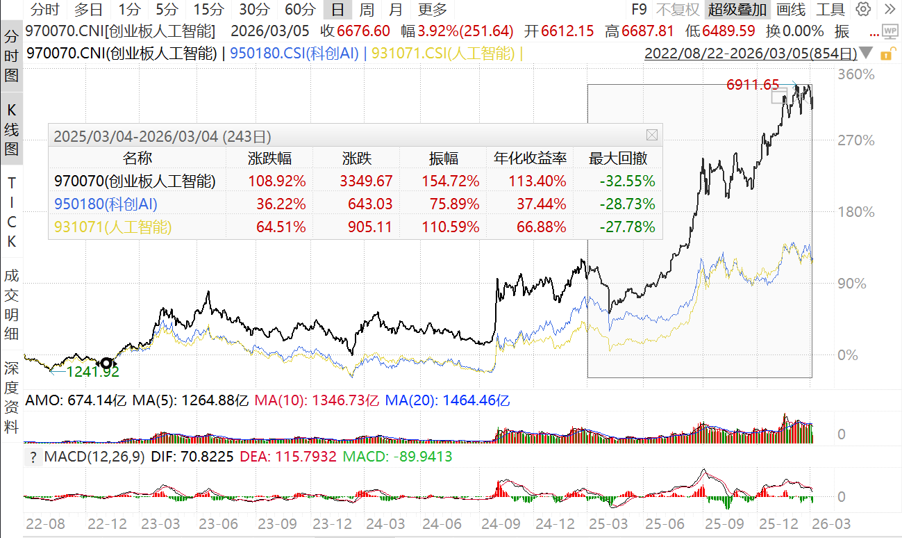 数据也挺硬,跟踪指数2025年净利润增速预测高达127%,远高于创业板整体水平。从历史表现看,近一年涨幅近109%,显著跑赢同类科创AI(36.22%)和中证人工智能指数(64.51%)。