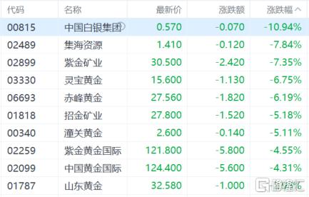 黄金股下挫,中国白银集团跌超10%,集海资源、紫金矿业跌超7%,灵宝黄金、赤峰黄金跌超6%,招金矿业、潼关黄金等跟跌。