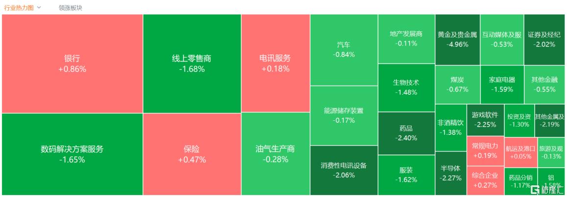 港股三大指数午后集体跳水且尾盘跌幅进一步加大,市场未能延续继续反弹行情,且止步3连涨。截止收盘,恒生指数跌0.33%报26346点,国企指数跌0.97%报9375点,恒生科技指数跌1.26%险守6000点。