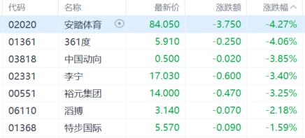体育用品股普跌,安踏体育、361度跌超4%,中国动向、李宁、裕元集团跌超3%,滔搏、特步国际跟跌。
