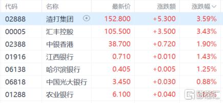 银行股震荡走高,渣打银行、汇丰控股涨超3%,中银香港、江西银行、哈尔滨银行跟涨。