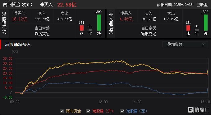 今日,南向资金净买入22.58亿港元,其中港股通(沪)净买入18.12亿港元,港股通(深)净买入4.46亿港元。