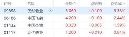 连续下跌的港股乳制品股迎来反弹,优然牧业涨超3%,中国飞鹤涨超2%,中国圣牧、现代牧业跟涨。