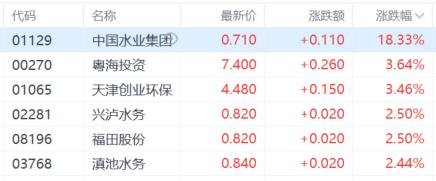 水务股涨幅居前,中国水务集团涨超18%,粤海投资、天津创业环保涨超3%,福田股份跟涨。