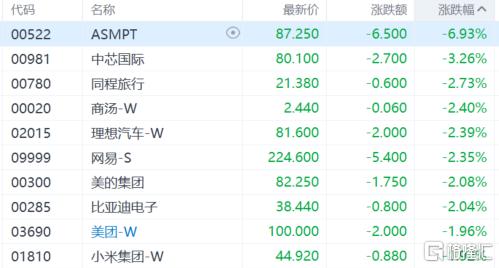 大型科技股多数下跌,中芯国际跌超3%,同程旅行、商汤-W、理想汽车、网易、美的集团跌超2%,比亚迪电子、美团等跟跌。