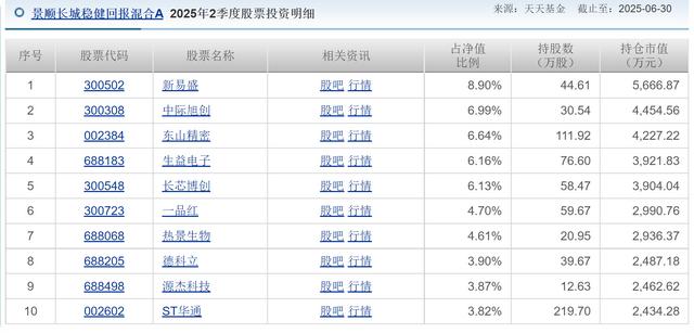 截至2025年中期,景顺长城稳健回报A的前十大重仓股均集中于AI产业链的核心环节,其中光模块领域的新易盛、中际旭创位居前两位,PCB领域的东山精密、生益电子以及存储相关的长芯博创也位列其中,前十大重仓股合计占比超过50%,呈现出显著的“算力聚焦”特征。这些重仓股所在的领域都是AI产业发展的关键环节,随着AI产业的快速发展,这些公司的业绩也有望持续增长,为基金带来丰厚的收益。