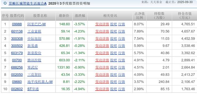 笔者发现,该基金明确界定了智能生活主题,涵盖智能家居、智能交通、智慧医疗等多个领域,通过定性与定量相结合的方法,自下而上地精选价值被低估且具有良好基本面的相关企业。如2025年三季报显示,其前十大重仓股包括阿里巴巴-W、工业富联、中际旭创等,这些公司均在智能生活的不同环节具有显著优势。