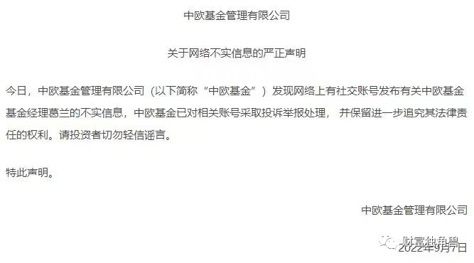 近1年,正在竭尽所能“低调”的中欧基金葛兰,9月7日再度遭遇“传言”,称其因业绩不理想而申请辞职。中欧基金当天就发布了严正声明进行“辟谣”,并表示保留追究“造谣者”的法律责任。