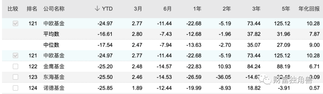 另外,中欧基金旗下股票型基金产品今年以来收益率为-24.97%,在所有股票型类基金公司中排名倒数第四(121/124)。