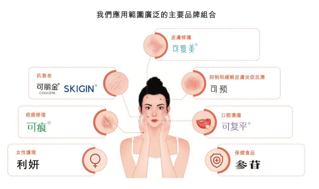 至于其他六大主要品牌——「可预」:旨在用于缓解和抑制皮肤炎症反应的重组胶原蛋白品牌;「可痕」:旨在用于疤痕修复的重组胶原蛋白品牌;「可复平」:用于口腔溃疡预防和修复的重组胶原蛋白品牌;「利妍」:用于女性护理的重组胶原蛋白品牌;「欣苷」:基于稀有人参皂苷的皮肤护理品牌;「参苷」:人参皂苷类保健食品品牌,为消费者提供营养素补充剂,改善其免疫系统。