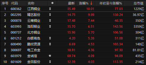 今天A股铜板块大涨,江西铜业、精艺股份涨停,云南铜业、洛阳钼业、北方铜业等多股大涨。
