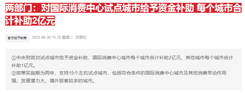 两部门:对国际消费中心试点城市给予资金补助,每个城市合计补助2亿元。