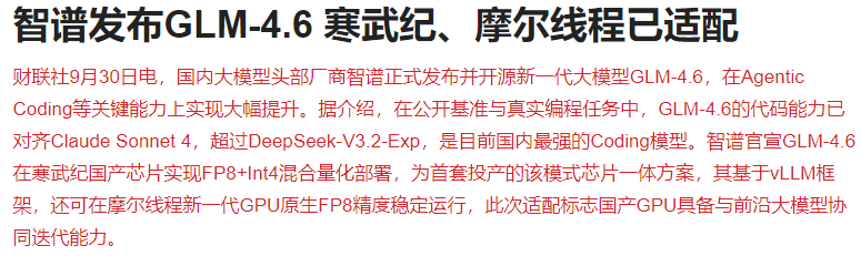 刚智谱发布GLM-4.6,寒武纪、摩尔线程也已适配。受deepseek利好刺激,今天寒武纪、海光信息等国产算力高开,但盘中跳水,寒武纪收涨0.11%,海光信息跌超1%,能够发现国产算力对这种利好也越来越不敏感了。