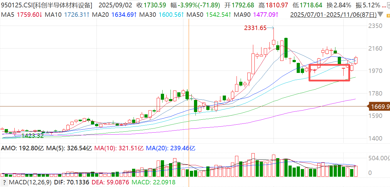 光有基本面还不够,市场还得“买账”。从技术走势看,科创半导体材料设备指数在10月-11月震荡区间中跌到1920点附近就止住了。这个位置恰好是9月的密集成交区以及50日均线上方,属于典型的“强支撑位”。