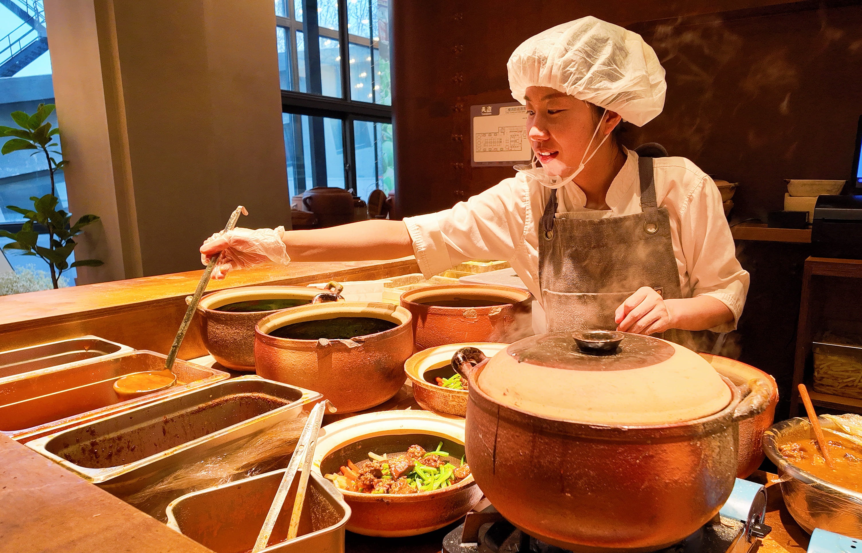 开业首日,天边砂锅焖面上海首店用餐高峰期排队时间超过一小时。时代周报记者于4月2日中午1点到店时,门口仍需排队等位。店内基本满座,部分菜品已售罄。门店采用明厨亮灶设计,砂锅在灶台上依次排开,焖面制作过程全程可见。